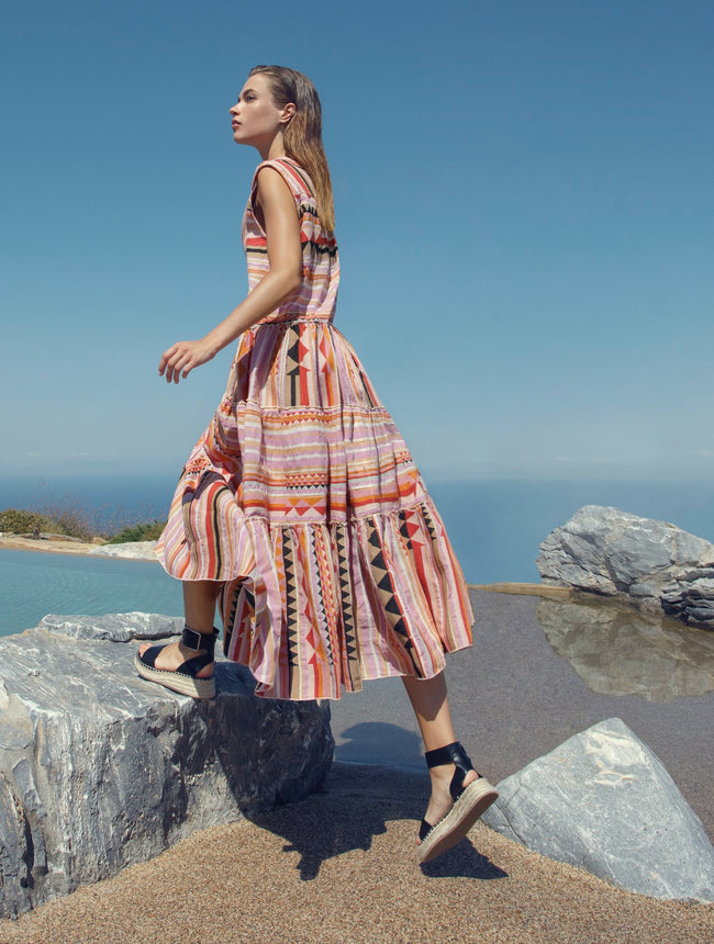 Many classic imagines and symbols of ancient Greek civilisation are depicted in natural fabrics, embroideries and hand-made details on tunics and dresses. Clean lines, minimal structures and geometric patterns make up the back bone of this all 'Made in Greece' brand.